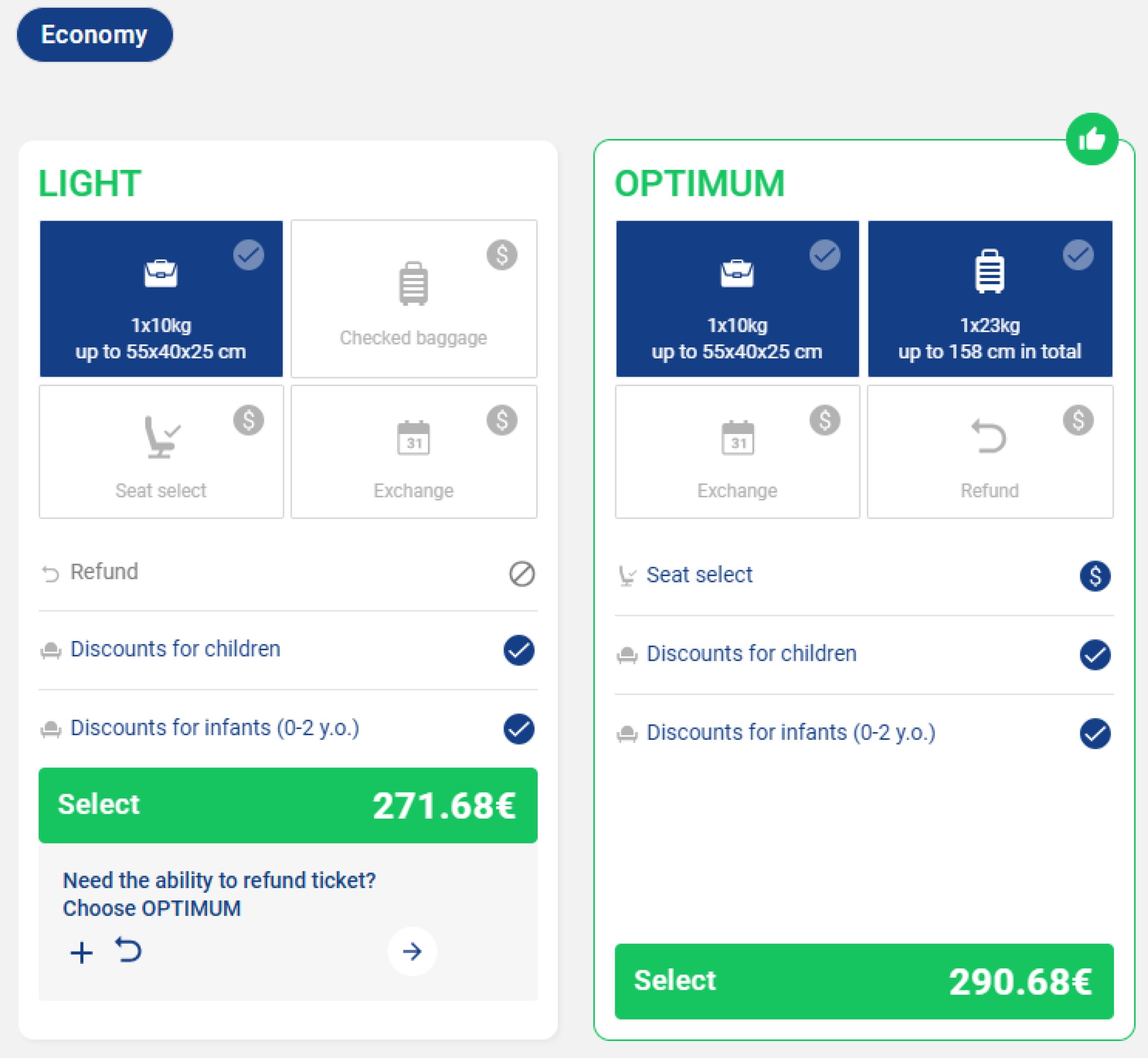 Du kan vælge mellem to forskellige prisklasser, når du køber din flyrejse:
