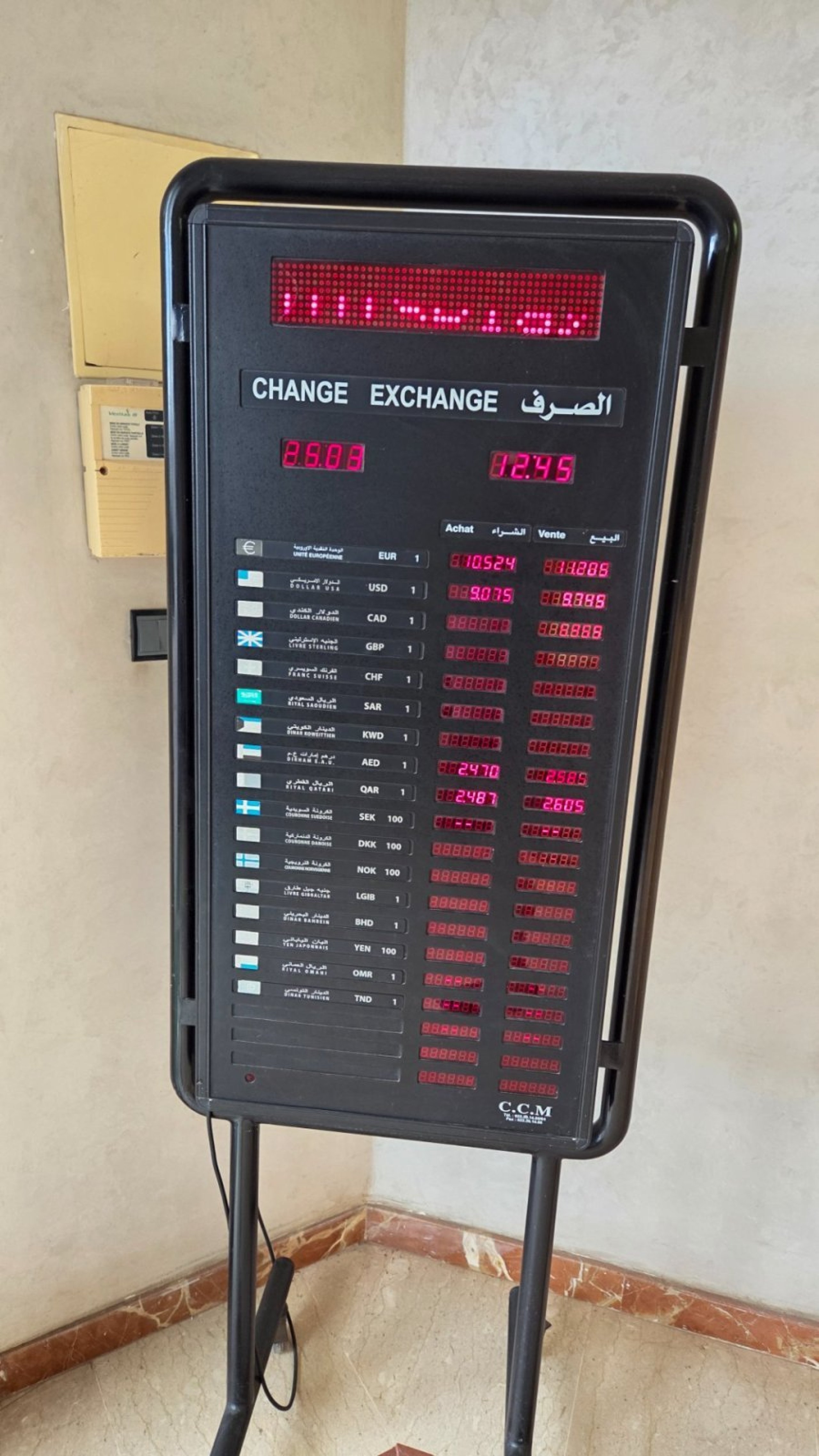 Oktober 2025, eurokurs 10,44-47. Før du forlader lufthavnen. I byen er kursen 10,47 ... CS tager 2,38 pr. dh ... så det er næsten ligegyldigt, om du betaler med kort eller kontanter ...