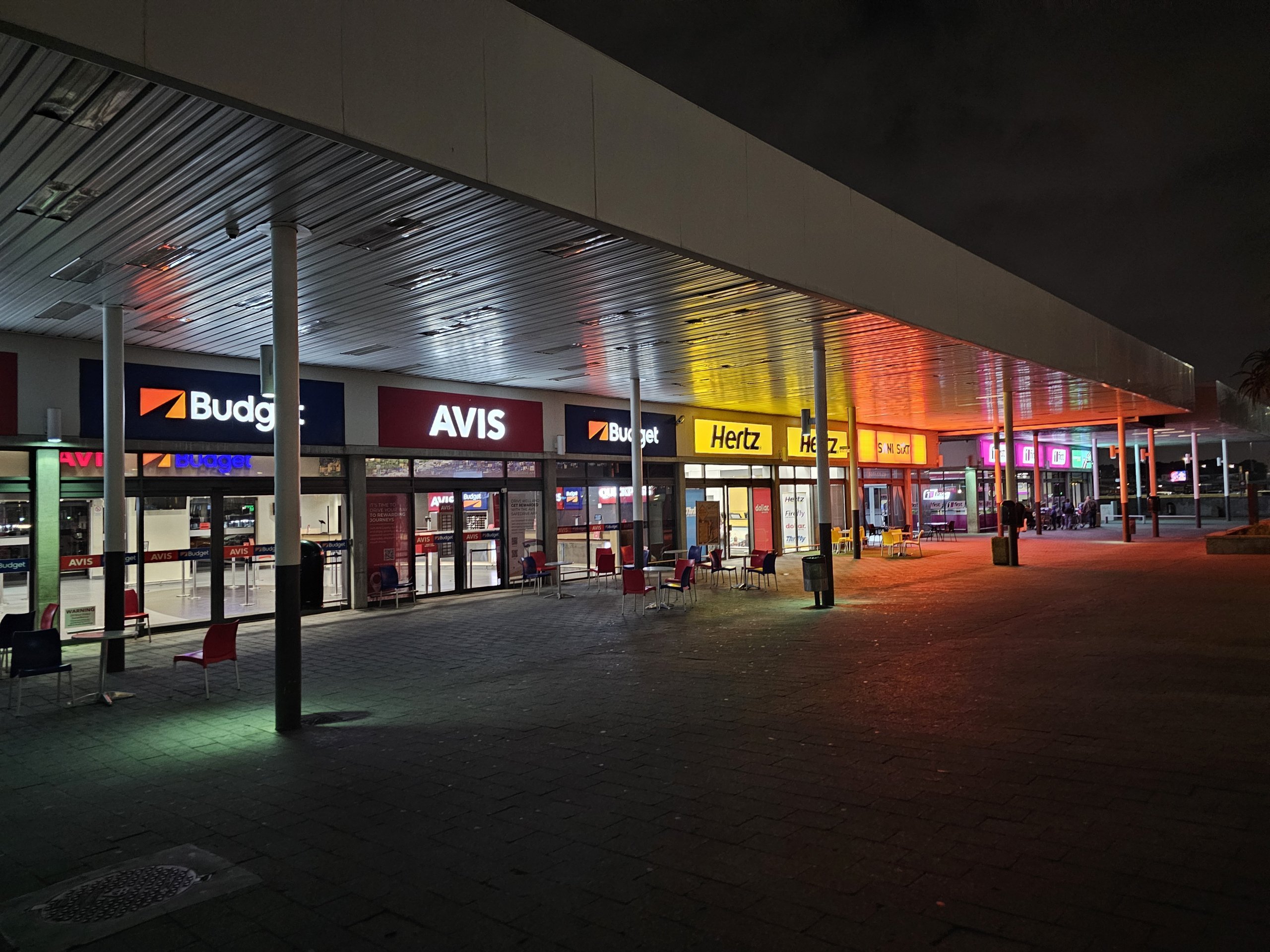 Alle biludlejningssteder ligger ca. 3-5 minutters gang fra terminalen langs en velafmærket fodgængersti.