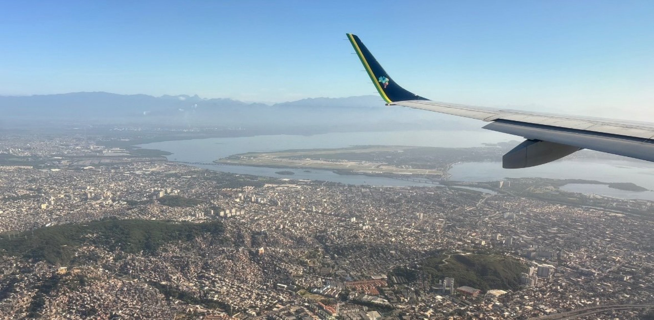 Udsigt over Galeão-lufthavnen ved Ilha do Governador under en GRU-SDU-flyvning i Embraer-195 fra Azul Linhas Aéreas.