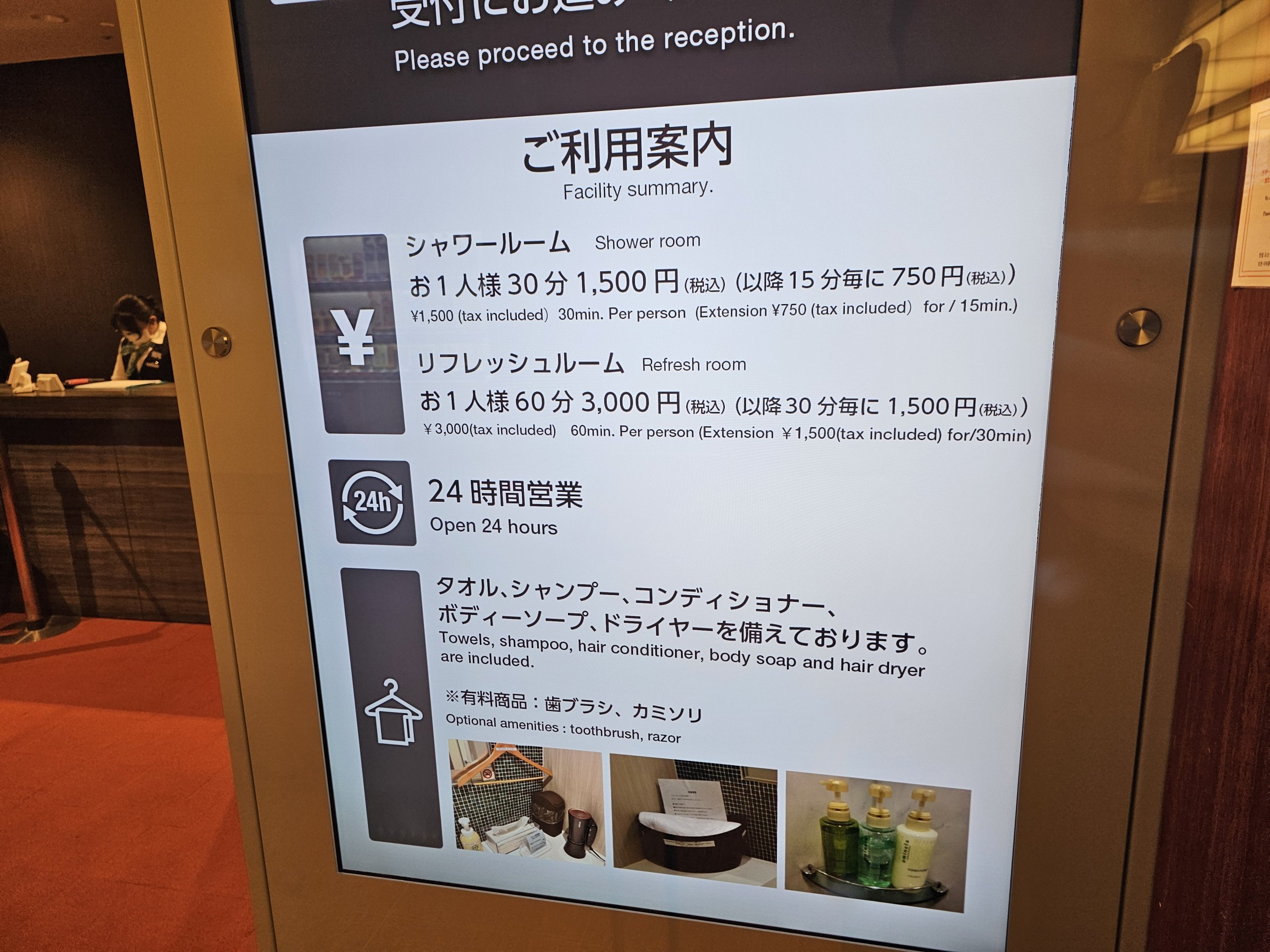 - Brusebad - offentligt område, ankomst 1F, åbent 5:00-10:00/16:00-22:00, gebyr for 30 minutters brusebad 1 500 jpy