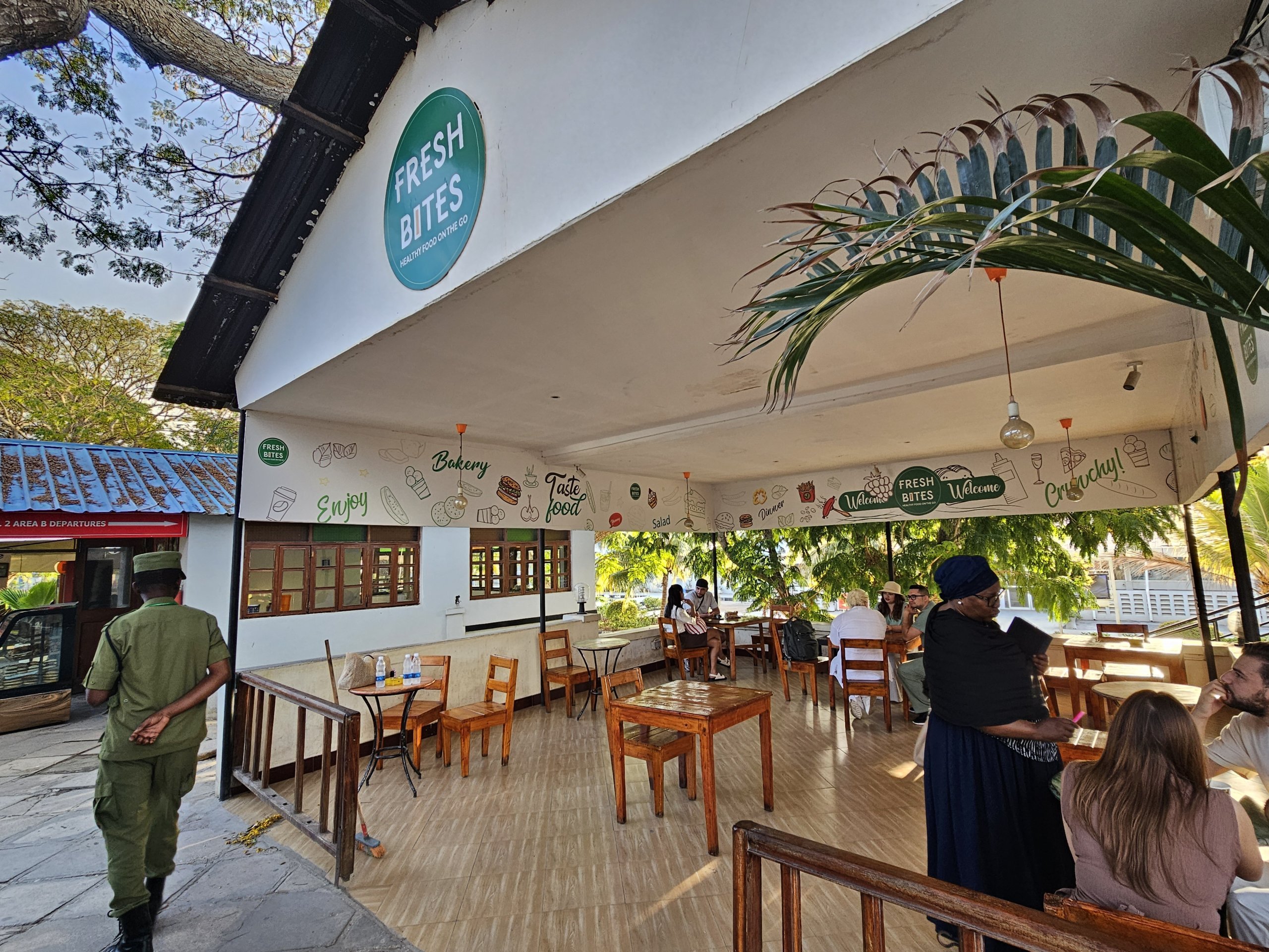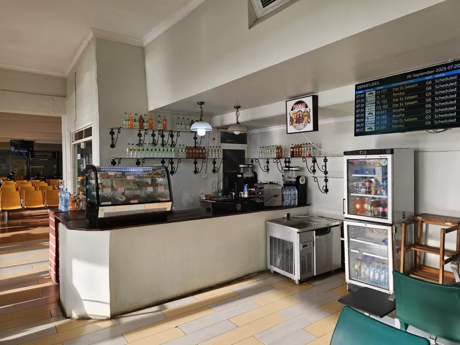 I den internationale terminal finder du en restaurant, en bar og en lille bistro efter sikkerhedskontrollen. Priserne her er flere gange højere end andre steder på Zanzibar.